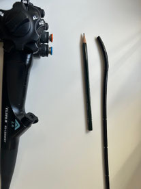 現在使用しているスコープは先端部径 5.8mmと 初期の経鼻内視鏡よりも細いため 鼻を通過するときの違和感が減り鼻出血の頻度が低くなりました。喉を越えて食道に入るのも容易になり患者さんからも好評です。鉛筆と同じくらいの細さです。鎮静剤使用もごく少量で問題ありません。